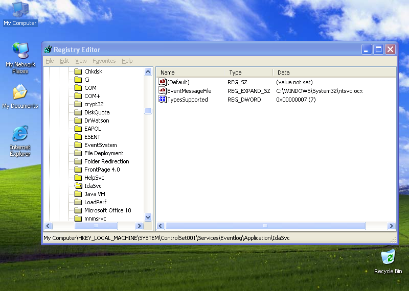 • [HKEY_LOCAL_MACHINE\SYSTEM\ControlSet001\Services\Eventlog\Application\IdaSvc] "EventMessageFile"="C:\WINDOWS\System32\ntsvc.ocx"